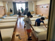 シーツをたたむのに苦戦していますが、部屋のメンバーと協力しています。