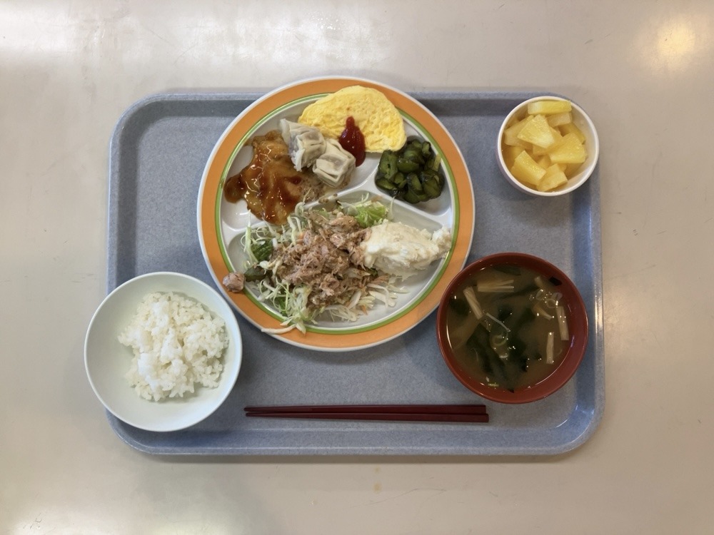 朝からみんなたくさん食べています。パイナップルが大人気。